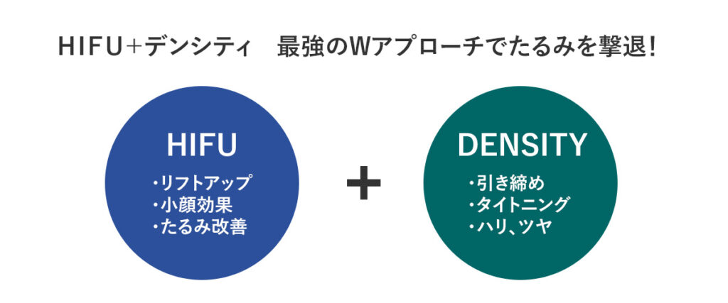 デンシティと医療ハイフの組み合わせた施術は、異なる作用深度とアプローチにより、それぞれ単体での施術以上の相乗効果でたるみ改善に高い効果が期待できます。